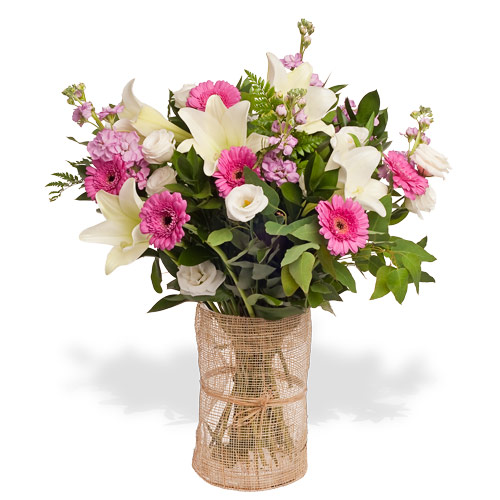 זר פרחים בגוונים לובן ורוד בסגנון אלגנטי קלאסי, שזור שושן צחור, ליזיאנטוס ,גרברות ומנתור, מכיל אלימנטים ירוקים ולבנים מגיע עם קישוט, אריזת רשת שקופה.